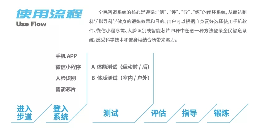 “智能步道”可以為民眾提供更全面智能的運動體驗,首次進入“智能步道”即可感受到科技棧道的魅力,民眾可以根據(jù)自身喜好選擇使用手機APP、微信小程序、人臉識別或智能芯片四種中任意一種方法登錄全民智道系統(tǒng),系統(tǒng)即可采集用戶的體能(呼吸、心率、體溫)、體質(zhì)和運動數(shù)據(jù),并經(jīng)過大數(shù)據(jù)分析,根據(jù)用戶體能、體質(zhì)狀態(tài)給予科學化、個性化的運動建議及健康飲食建議,還可以通過手機實時享受“電子私教”智能語音健身干預及運動指導的服務(wù)。