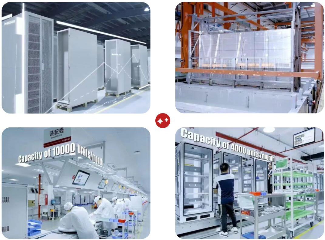 集成車間引進(jìn)了戶外柜生產(chǎn)線,產(chǎn)能平均高達(dá)4000臺/月)。采用電子看板,可實(shí)時顯示工序SOP,設(shè)有淋水防護(hù)測試、性能測試,掃碼系統(tǒng),并單獨(dú)設(shè)立了嵌入式電源ATE測試工位,可實(shí)現(xiàn)電源的自動檢測和數(shù)據(jù)記錄。同時引進(jìn)了微站電池生產(chǎn)線,產(chǎn)能高達(dá)10000臺/月),采用電子看板,設(shè)有耐壓測試、氣密測試,并單獨(dú)設(shè)立了ATE測試、充放電老化測試工位,進(jìn)行嚴(yán)格、專業(yè)的安全、性能及可靠性測試。